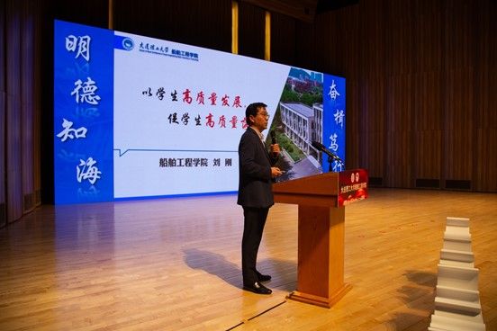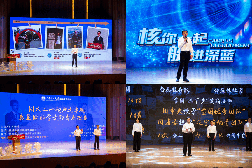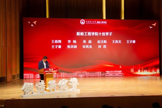 优秀学子讲演环节以三大篇章为主线,邀请共15位优秀学子分享成长故事,弘扬榜样力量,传递青春强音。校优秀研究生标兵郭育豪展现了科研道路上迎难而上的勇气与担当:“船舶人的浪漫,是将理想镌刻在国之重器的龙骨上。”研究生高质量落位代表孔嘉昊分享了自己在求职过程中的感悟与收获:“在日常学习生活中要注重能力积累,精准把握信息、找准自身定位,打铁还需自身硬。”国家奖学金获得者张超提到:“作为大工船舶学子,我们不惧怕失败,每一次失败都是迈向深蓝的浪花,唯有迎难而上,才能驭浪前行。”