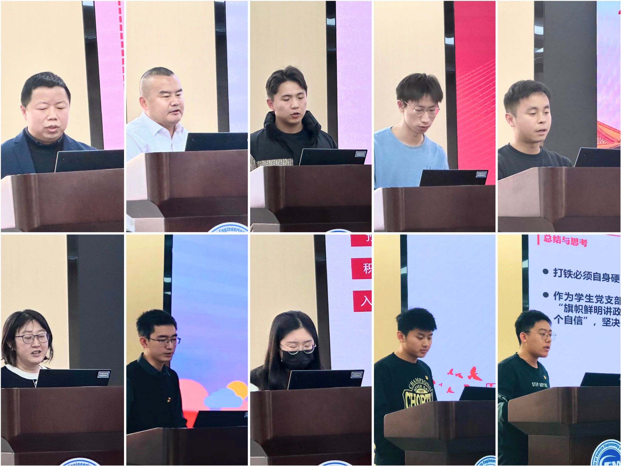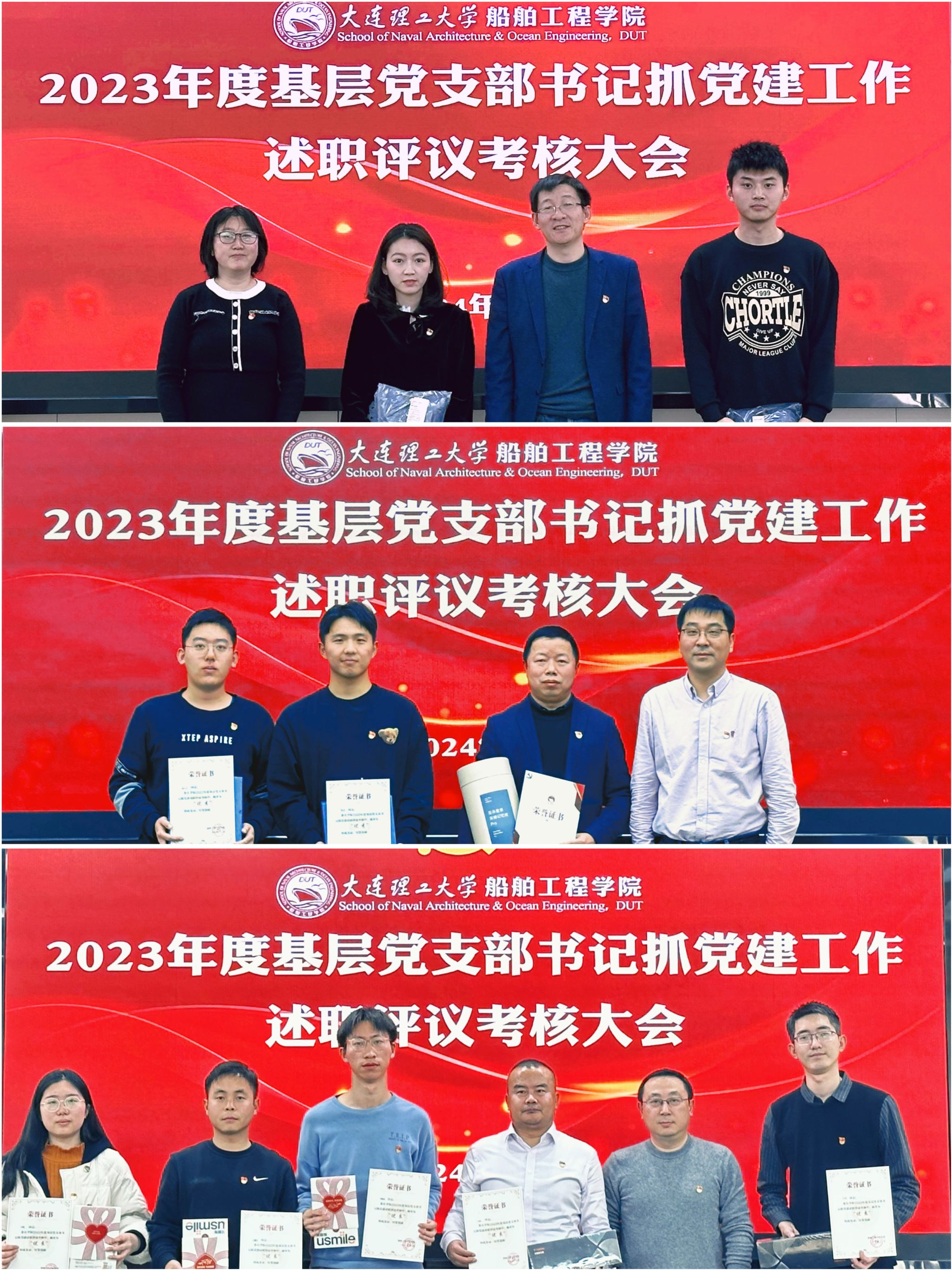 各党支部书记结合支部属性特点,突出职责定位,围绕强化师生思想政治引领、校企支部共建、党团共建、“课程思政”建设、“我为师生办实事”、党风廉政教育宣传等各方面“一融双高”建设举措进行汇报,展示了一年来以高质量党建引领事业高质量发展的建设成效。船舶教工第一党支部把党建创新与日常科研工作深度融合,积极拓展与领域内优势单位开展合作交流,校企合作又产硕果,支部与大连中远海运重工有限公司联合申报获批大连市揭榜挂帅项目《氨燃料动力船舶设计研究》。船舶教工第二党支部围绕“打造教学育人先锋”特色,获批教育部虚拟仿真联盟2023年度实验教学虚拟教研室,并入选首批校级专任教师样板党支部。船舶结构所博士生导师纵向党支部支部坚持以人才培养为根本,组织支部教师党员观摩其他优秀教师的教学案例,注重帮助博士生解决工程实际的科学问题。船舶本科生辅导员纵向党支部不断健全对本科生的思想政治引领机制,以“强国有我,红砖有为”“攀研·科技沙龙”等就业发展类、红色传承类和能力提升类特色实践活动为依托打造样板示范。各研究生党支部围绕坚持党建带团建、开展科研学术交流活动、加强就业方向指导、组织志愿服务活动等特色工作进行汇报,学院研究生党员获评高校跨学科社会创新课程联盟2023年学生项目成果展暨大赛一等奖等各类科研竞赛等奖项及校优秀研究生等各类荣誉称号。