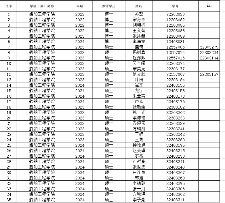 根据学校研究生评奖评优工作的安排,船舶学院于2025年9月13日启动评奖工作,截至9月16日14:00,共收到优研有效申请材料78份。经过严格评审,根据学校分配名额,最终名单已确定,推荐以下同学获得2024-2025学年校优秀研究生(见下表)。