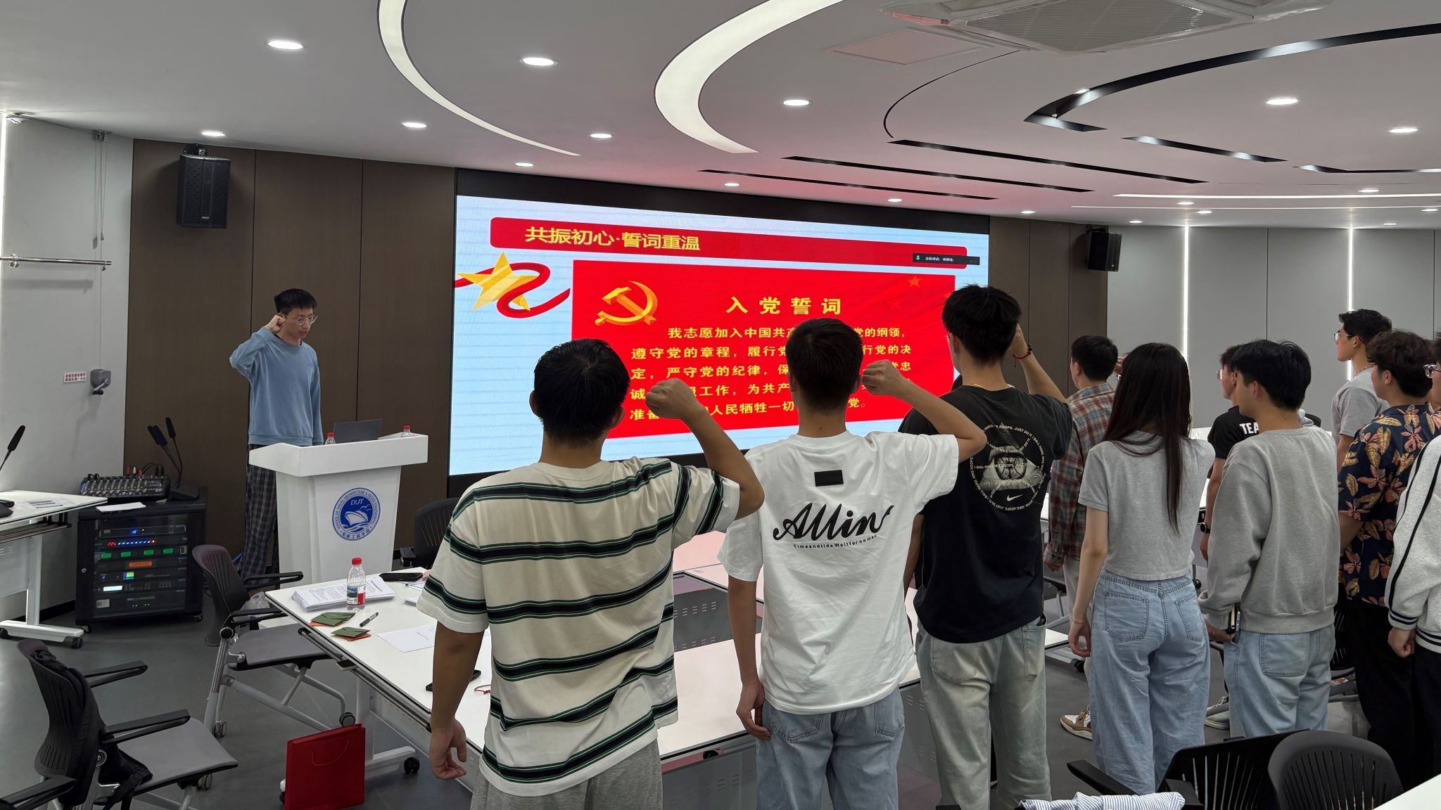 “共振初心·誓词重温”环节。在前任党支部书记母舰毋的领誓下,全体党员神情肃穆,举起右拳,齐声宣读入党誓词,铿锵有力的誓言在会议室久久回荡,每一个字都饱含着党员们对党的忠诚,彰显着他们投身海洋强国建设的坚定信念。党支部书记徐唯佳代表支部党员对毕业生党员送上深情寄语:“无论走到哪里,都要做一面鲜红的旗帜,一个坚强的堡垒”。话语虽简短,却字字千钧,寄托着支部对毕业生党员的信任与嘱托。