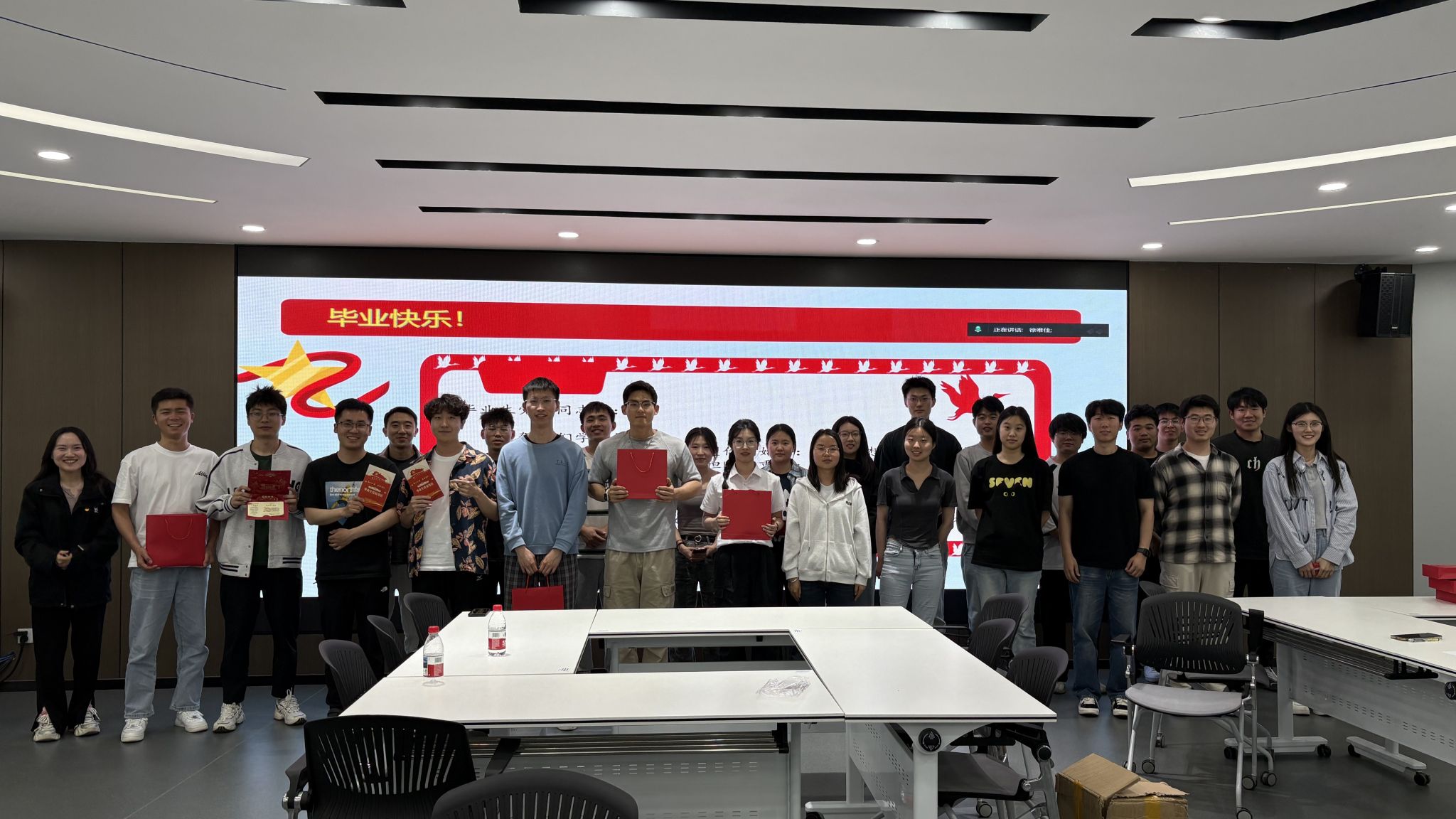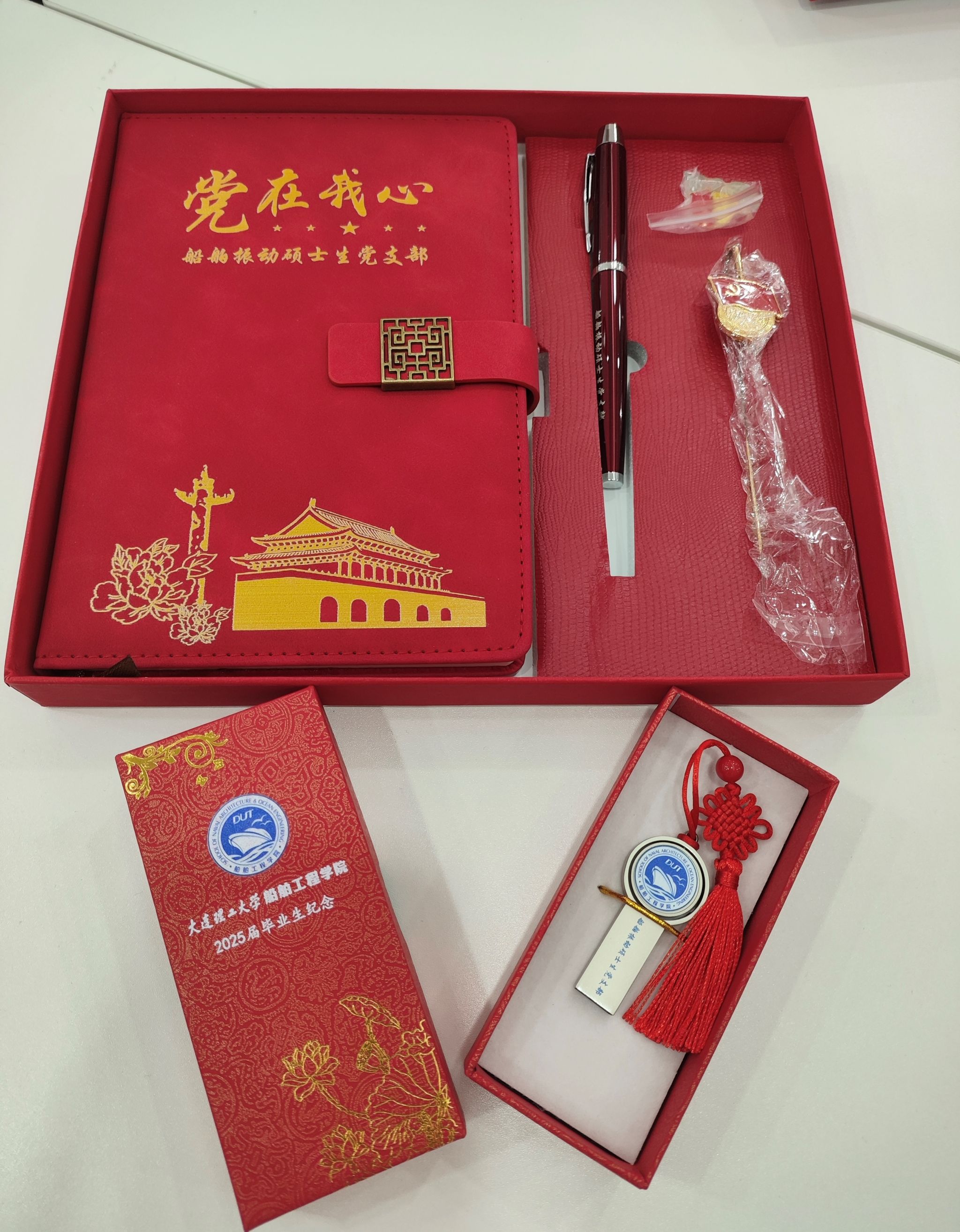 活动还特别设置了“振频记忆・学术传承”环节,为毕业生发放包含定制U盘、钢笔及笔记本、党徽和书签的“振动礼盒”。U盘寓意“存储知识,传递智慧”,希望毕业生在新的工作岗位上继续保持“数据同步”,让学术精神持续“共振”;钢笔暗含"笔耕不辍,破浪前行"的期许;笔记本封面采用烫金工艺印制“党在我心”四个大字,提醒毕业生不忘入党时的初心承诺,以饱满的热情和坚定的信念,奋力书写人生新的篇章。党徽和书签这份组合既是对党员身份的永恒铭记,也暗喻“在知识海洋中航行时,党旗永远是指引方向的灯塔”,提醒毕业生党员在面对复杂的技术难题和工作挑战时,始终牢记党员使命,以党的先进思想为指引,坚定前行方向。这份匠心独运的礼盒,将船舶振动专业的“频率”、“振幅”、“频谱”等概念转化为育人载体,生动诠释了组织的“振动频率”永远与奋斗者的心跳同频,激励毕业生党员在未来的工作中,与国家发展的节奏同频共振。