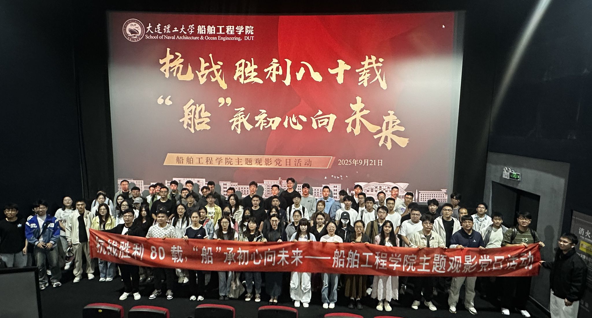 9月21日上午,学院党委组织80余名学生党员及入党积极分子集中观看反映侵华日军第七三一部队细菌战、人体实验等反人类罪行的电影《731》。本次活动由学院学生党员工作部策划,以“抗战胜利80载,‘船’承初心向未来”为主题,通过观影与互动教育,引导青年学子铭记历史、坚定理想信念,强化时代担当。